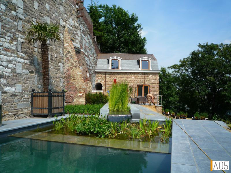 La piscine est entièrement écologique, chauffée par une pompe à chaleur. Le solarium est quant à lui en pierre bleue...