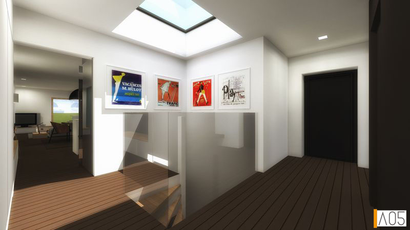 Le volume tout en longueur de l'étage, qui se compose des pièces de vie et d'une splendide terrasse, se pose sur un "socle" en brique foncée abritant les chambres et le garage.