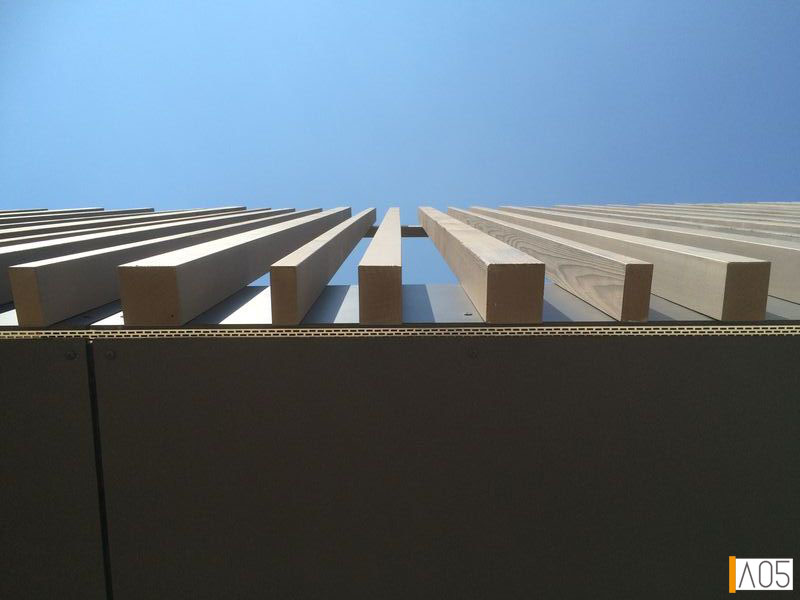 Un long mur technique (avec rangement intégrés) côté jardin se déploie perpendiculairement à la façade pour en préserver l'intimité. Une "première peau" massive en brique sombre sert de structure. En arrière plan, afin de bénéficier des ombres en cas de surchauffe, se développent les longues façades complètement vitrées laissant le dehors pénétrer le dedans, la coursive de l'étage permet de déambuler à l'ombre, même en plein été...