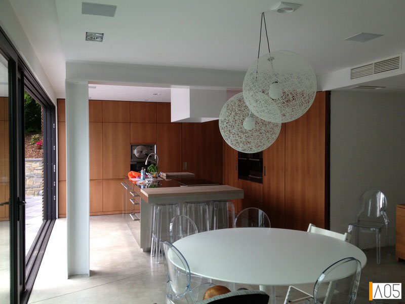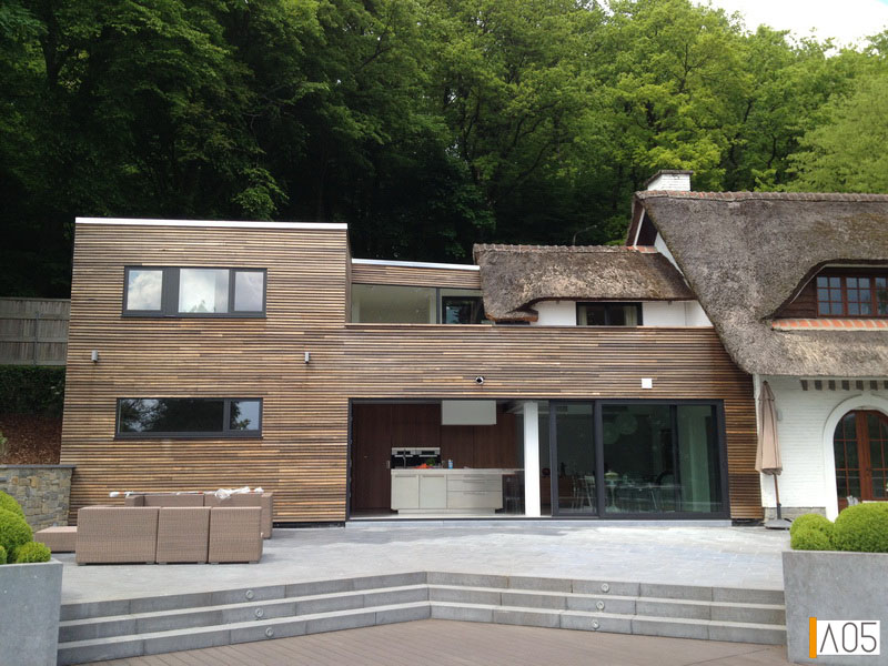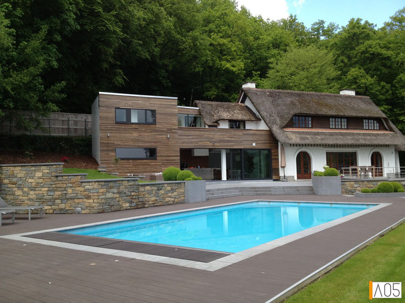 Dans un cadre exceptionnel, sur un terrain arboré, avec piscine, terrasse en pierre bleue, les propriétaires décident d'agrandir la maison existante.