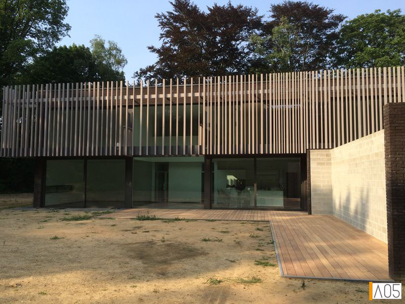 Un long mur technique (avec rangement intégrés) côté jardin se déploie perpendiculairement à la façade pour en préserver l'intimité. Une "première peau" massive en brique sombre sert de structure. En arrière plan, afin de bénéficier des ombres en cas de surchauffe, se développent les longues façades complètement vitrées laissant le dehors pénétrer le dedans, la coursive de l'étage permet de déambuler à l'ombre, même en plein été...
